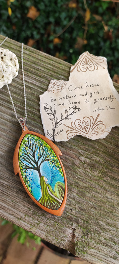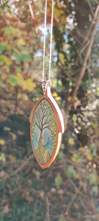 This miniature painting is a one-off wearable artwork. Hand painted with acrylic paint onto wood and set in a handcrafted wooden pendant frame. Com...